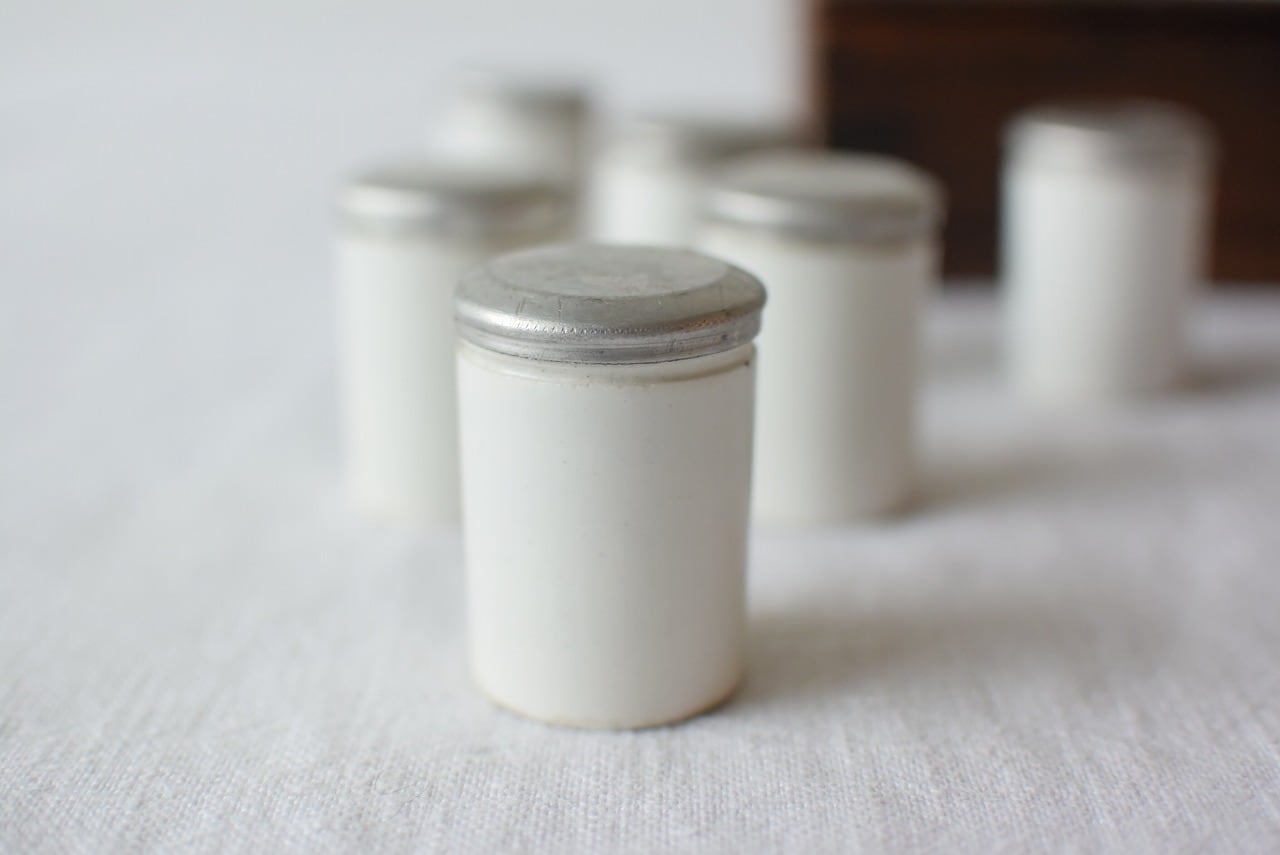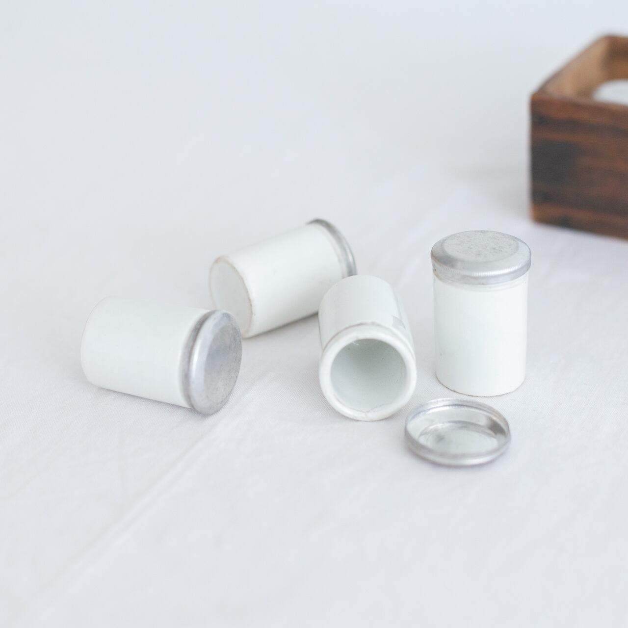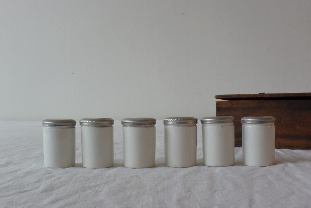 小さな木箱にちょうど収まる、アルミの蓋が付いた陶器の容器。