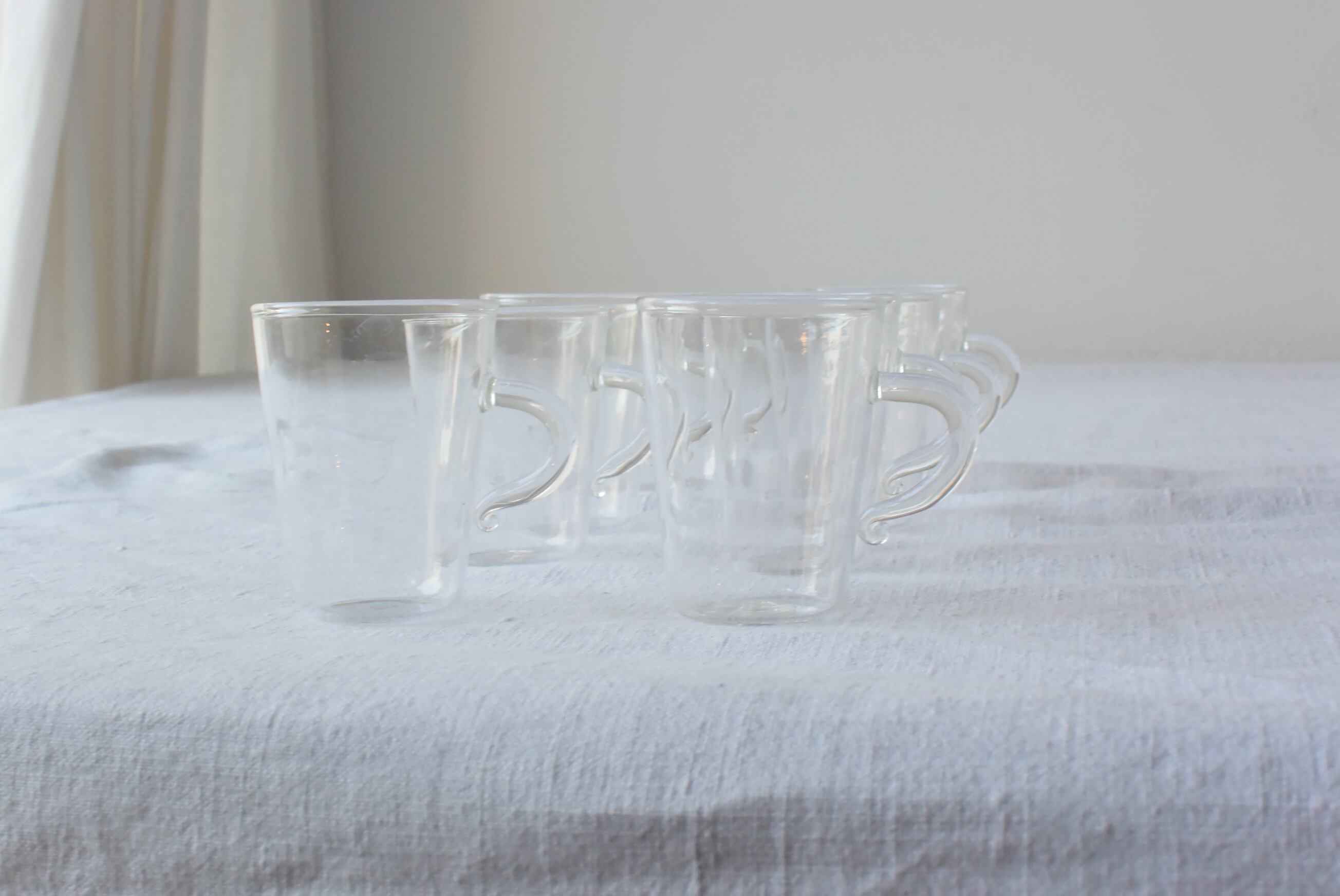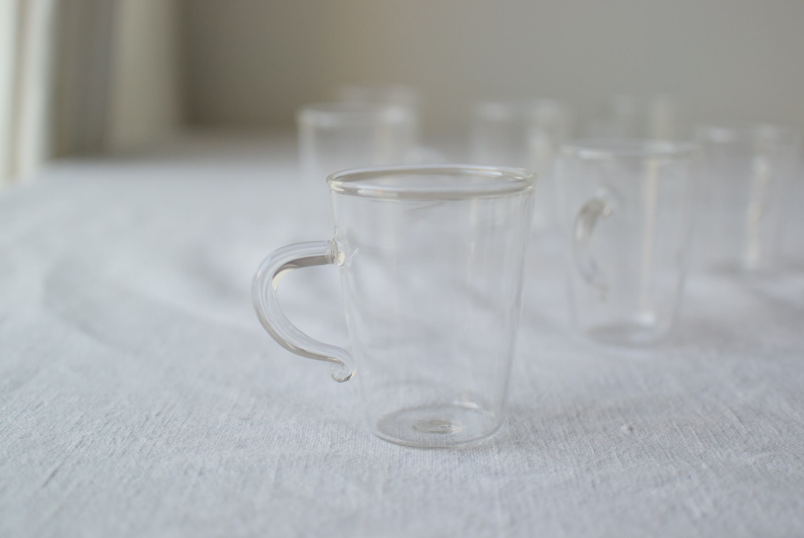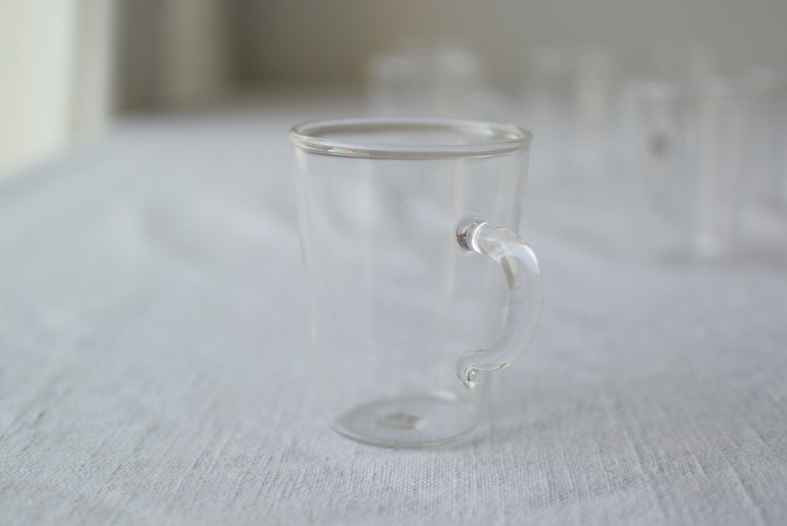 あまり古くないようにも見えますがゆらりとした表情と持ち手が素敵なガラスマグです。 口径4.8㎝高さ6㎝