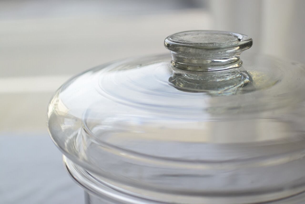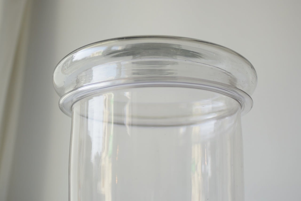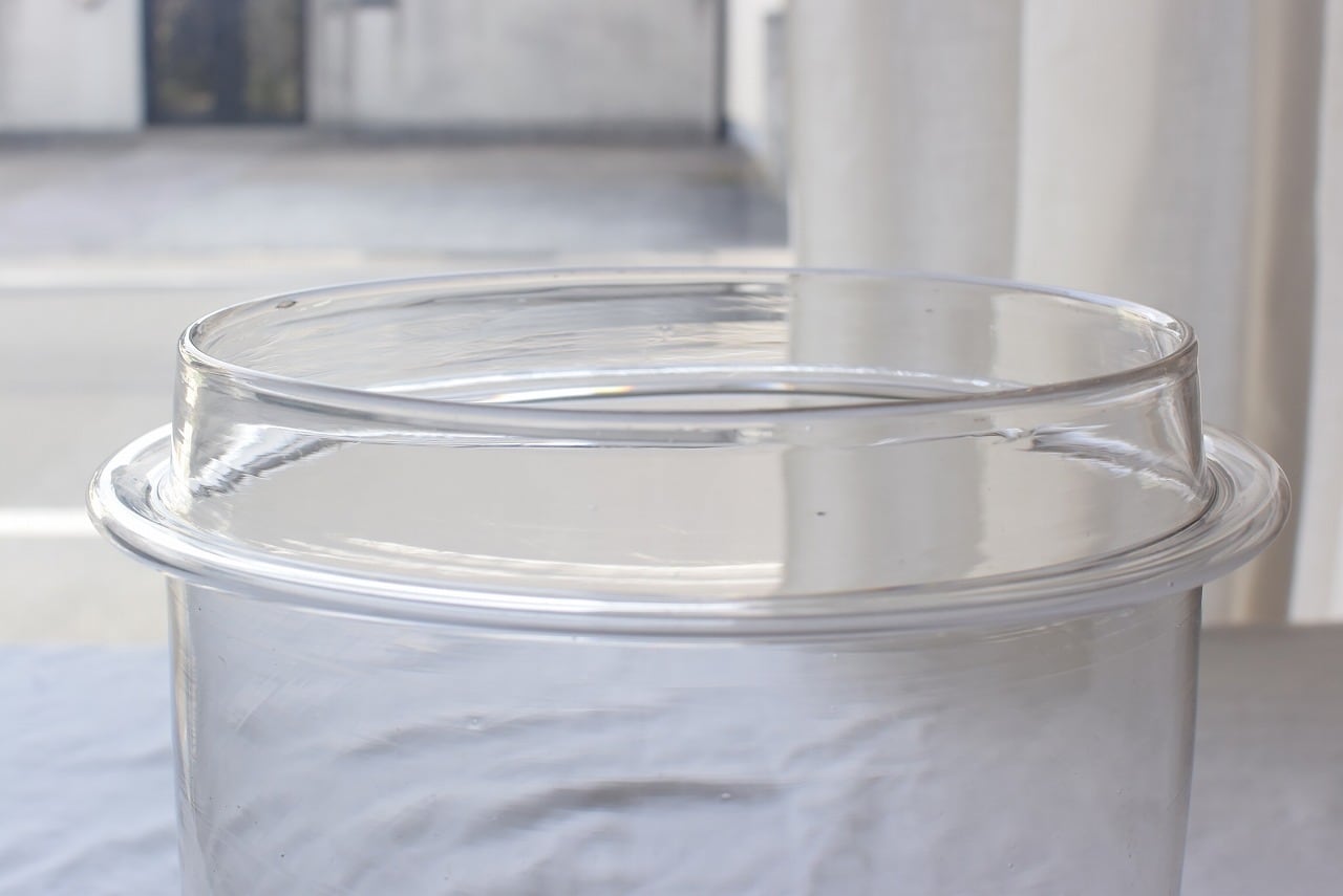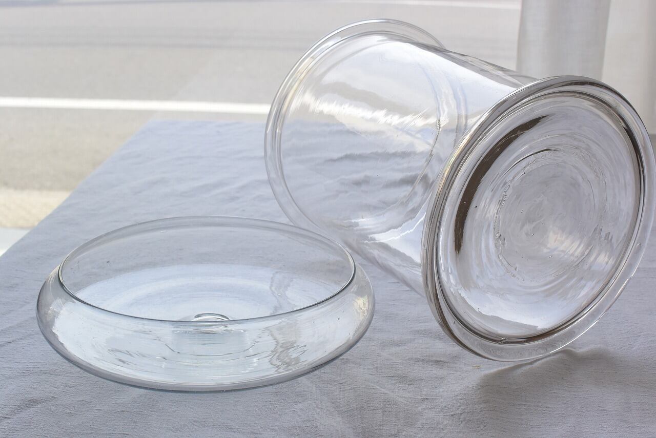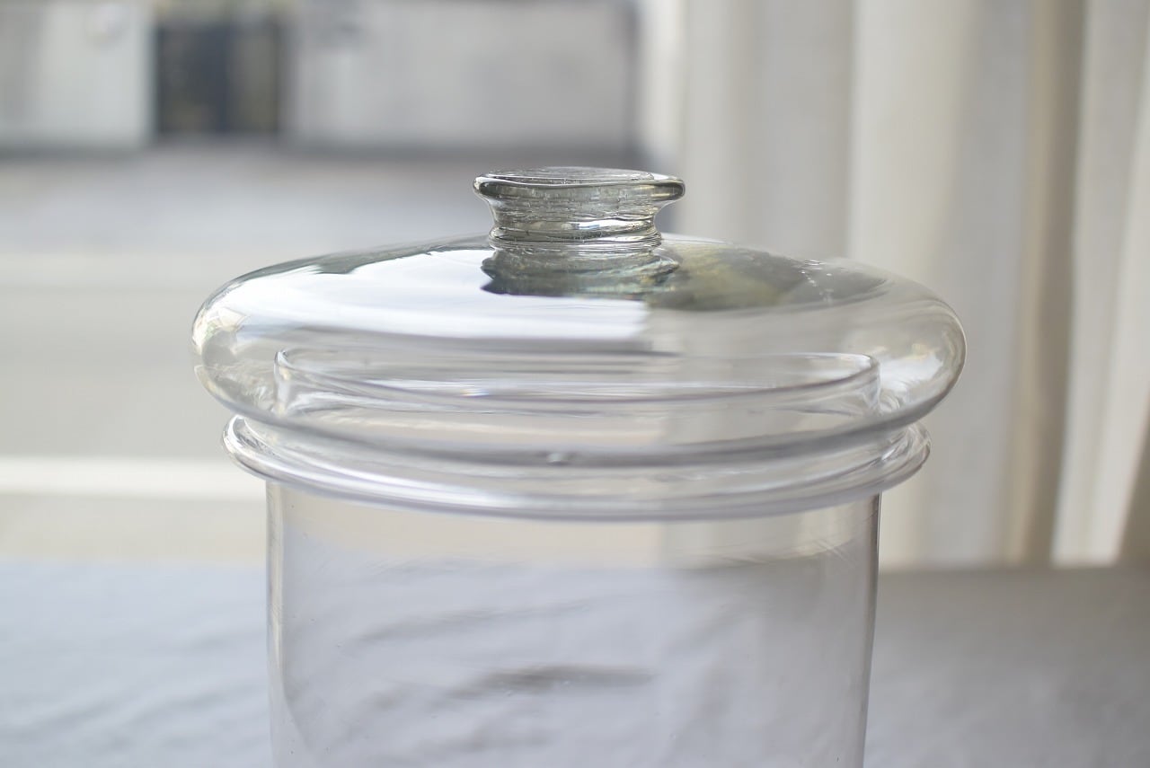 最近はなかなか出会えなくなってきた吹きガラスのガラス瓶。 大きすぎず小さすぎずなサイズ感。 直径19㎝(蓋の直径) 高さ26㎝ 口径14㎝