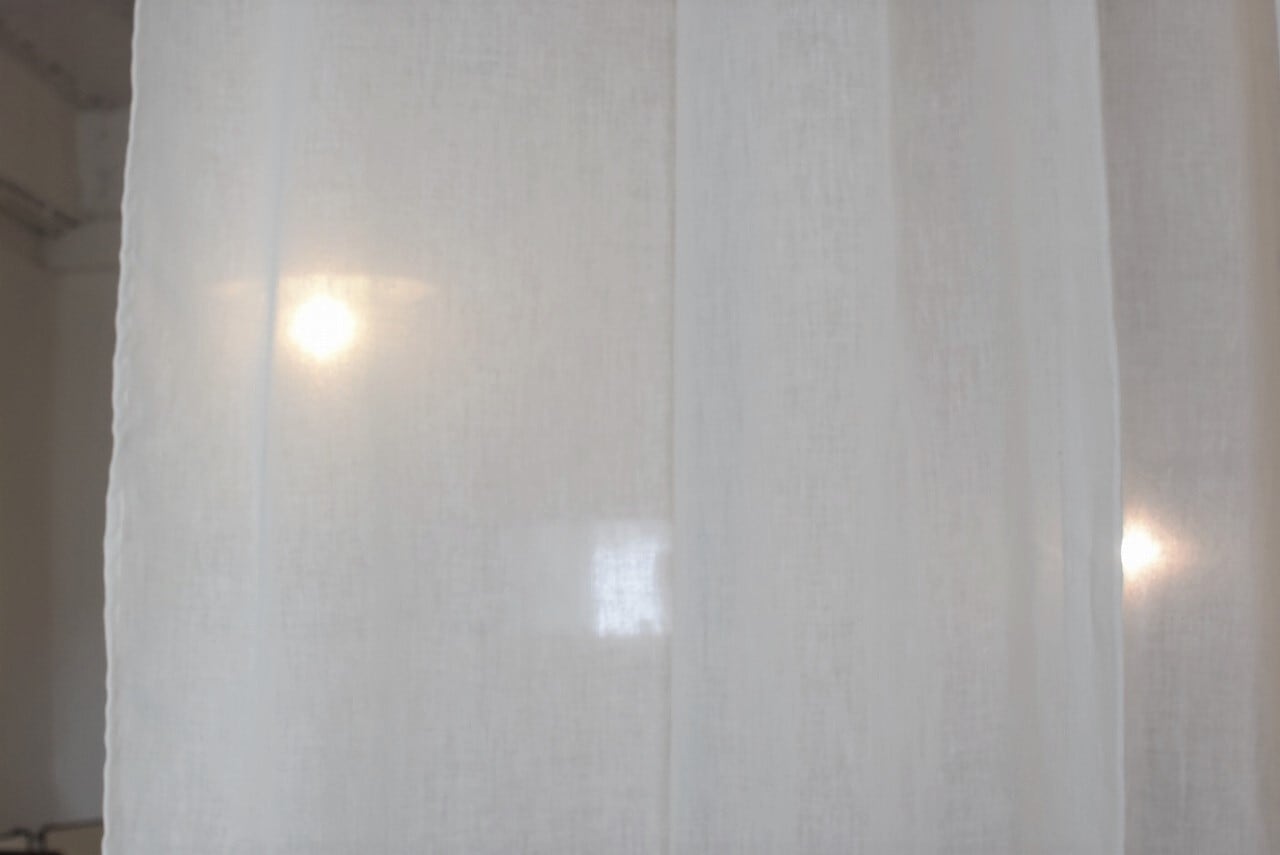 古い白磁のリングとコットンガーゼの組み合わせのカーテンです。