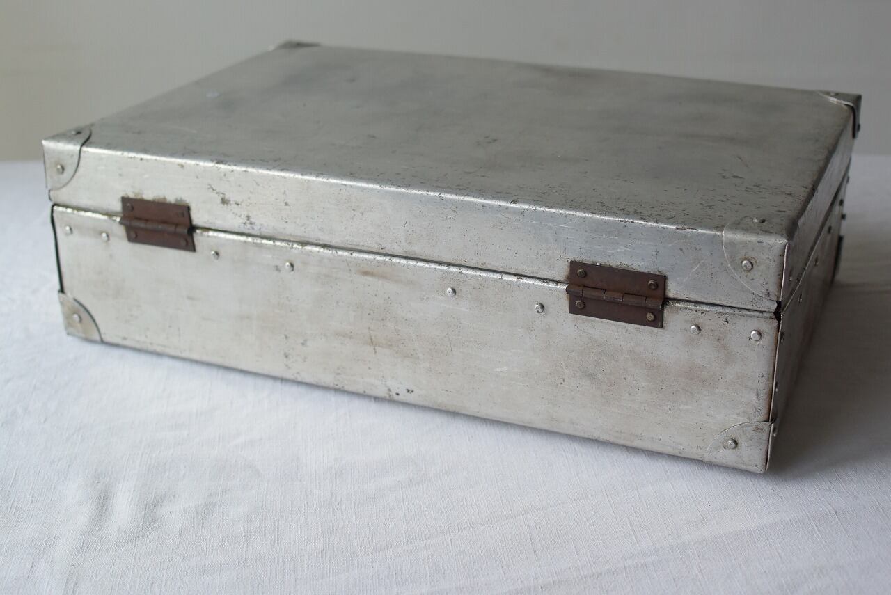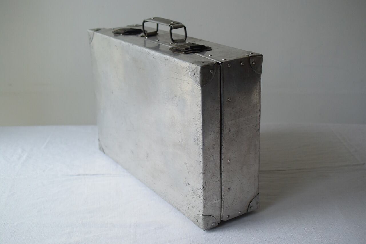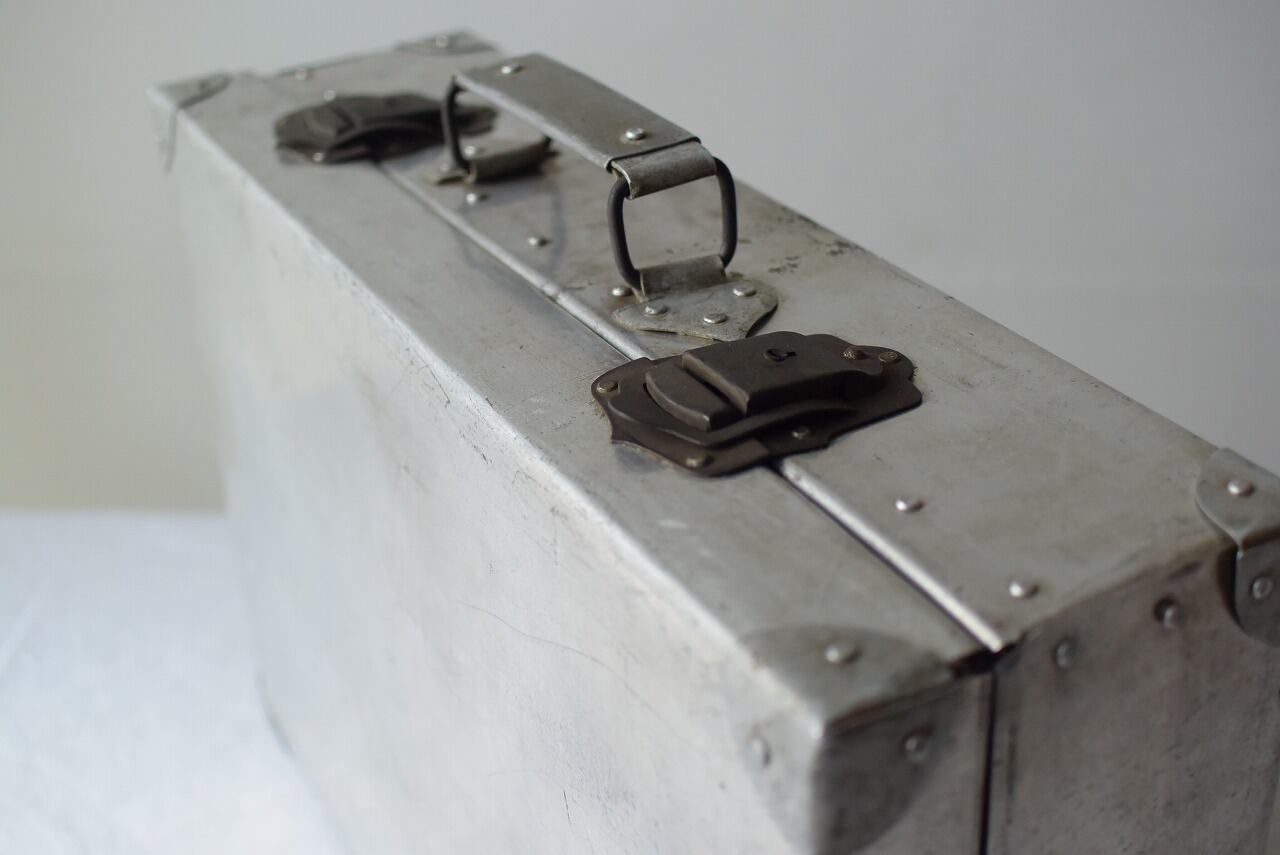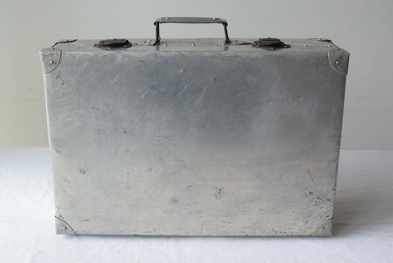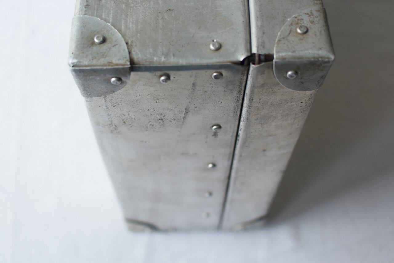 幅46.5㎝×高さ31㎝(持ち手含まず)×厚み14㎝ リベットのカッコよさ引き立つアルミトランク。 持ち手までアルミ製とはにくい。