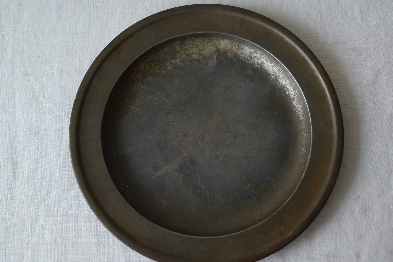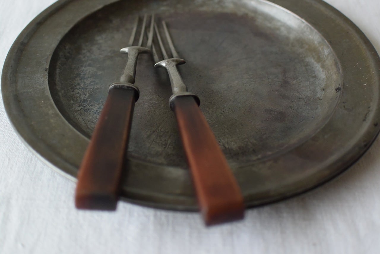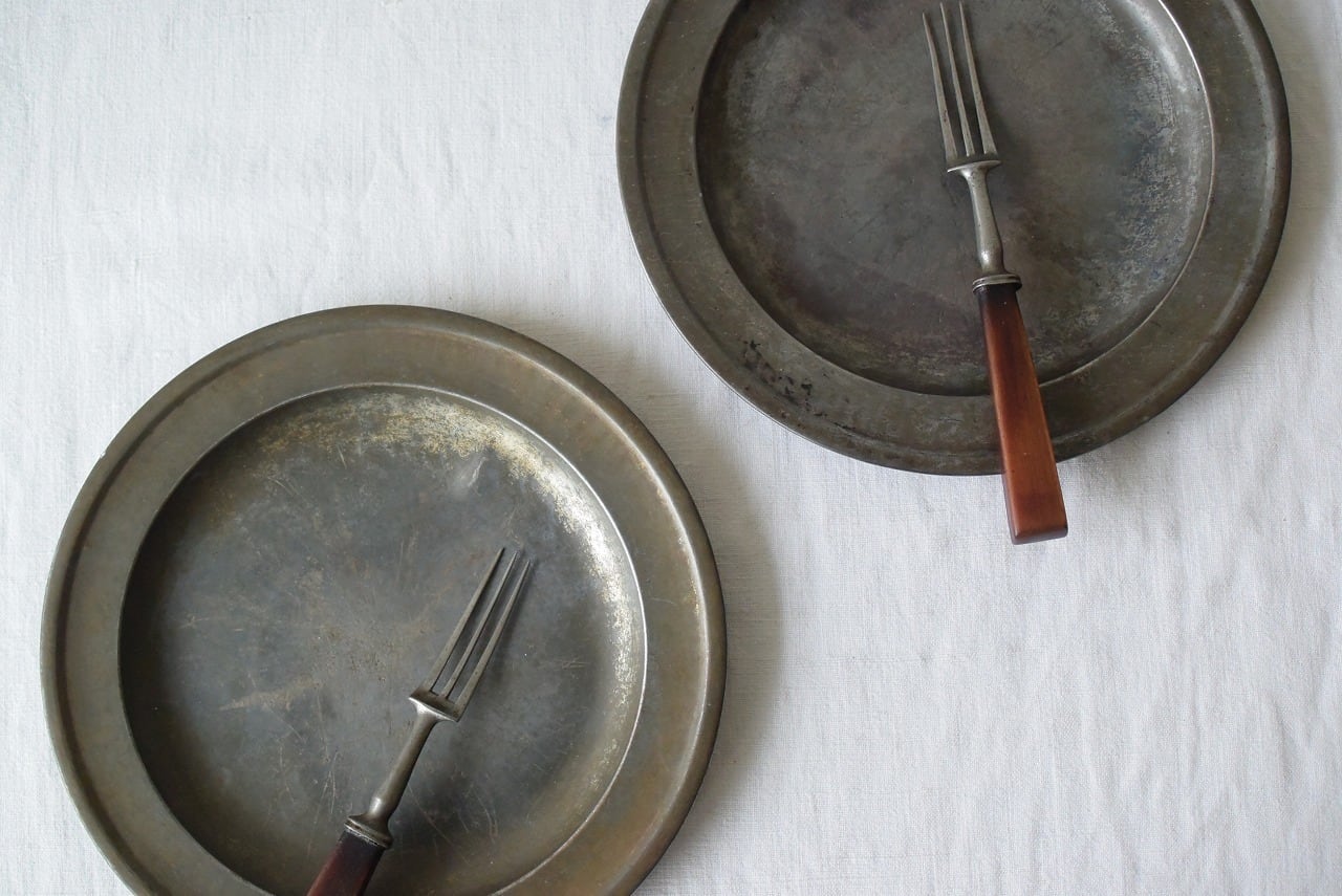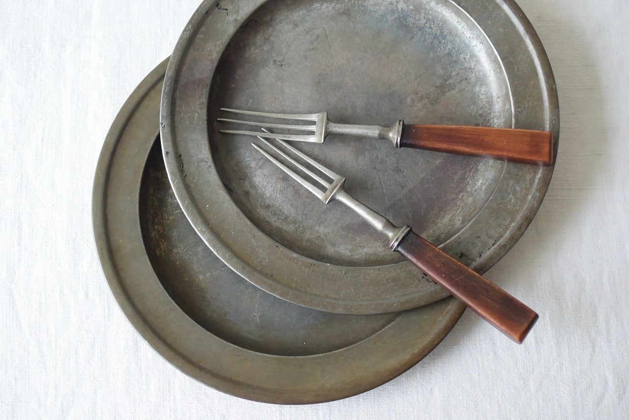 ブリキの皿は案外珍しいと思います。 雰囲気の良いお皿とフォークです。 直径20.5㎝ 2枚 フォーク17㎝ 2本