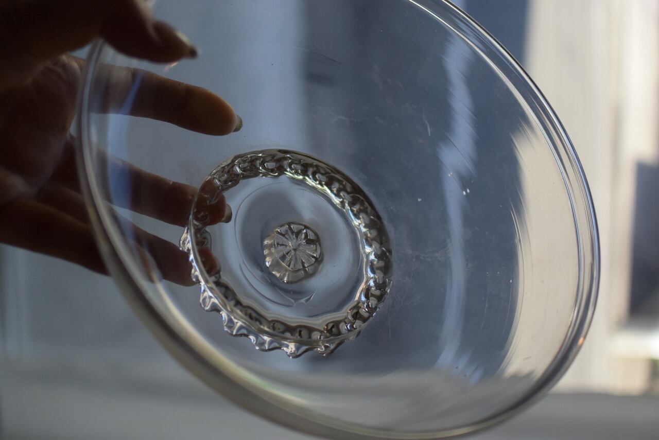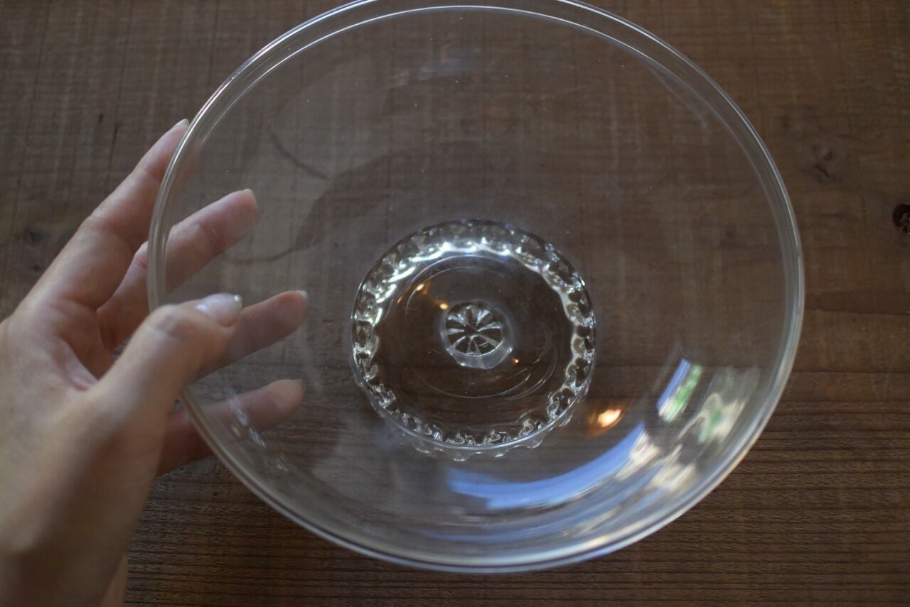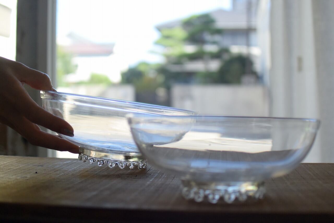 とても美しいガラスボウルです。 クラゲの脚のようなデザインの高台がとても可愛らしい印象です。 大きい方の脚に1箇所だけ欠けがあります。 写真でご確認ください。 こちらの商品は送料無料です。 直径18.5㎝高さ7.3㎝ 直径15.5㎝高さ6㎝