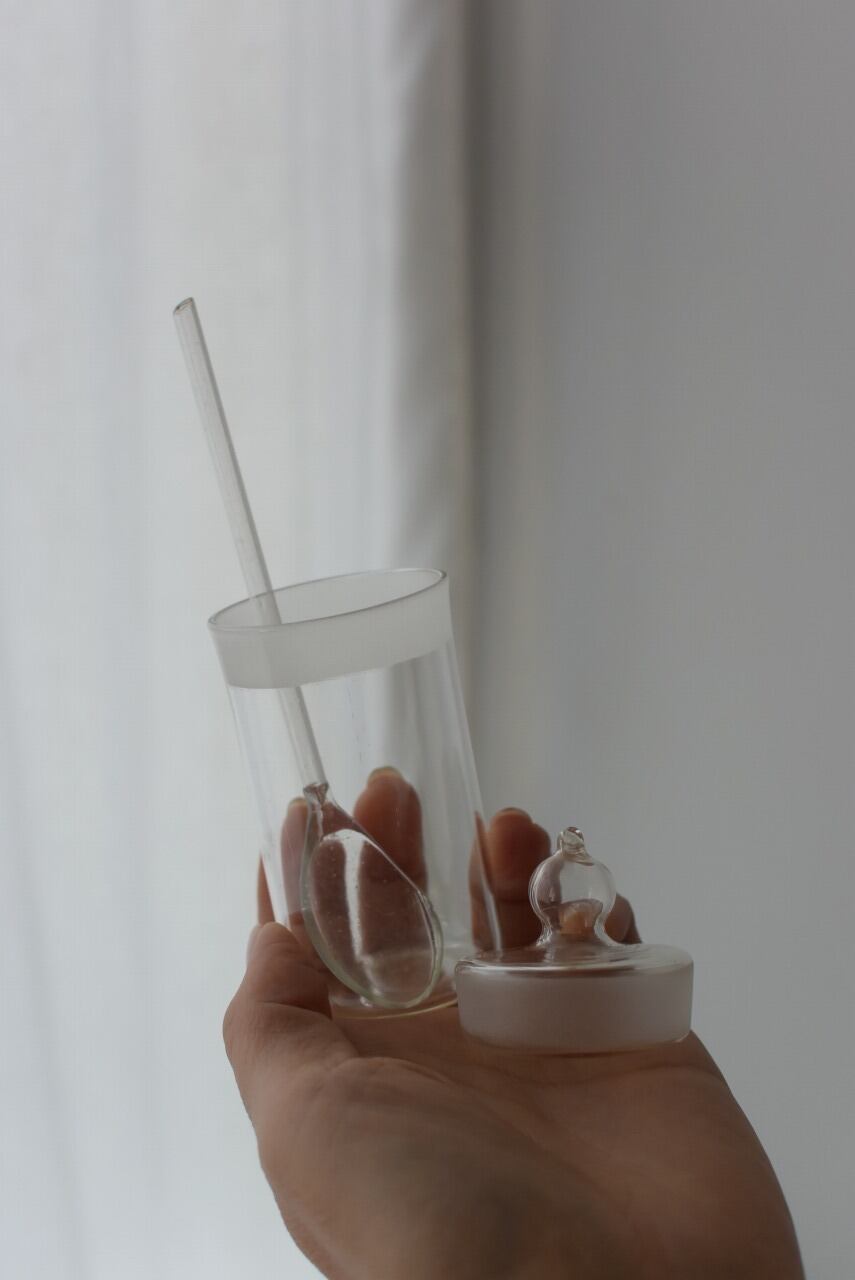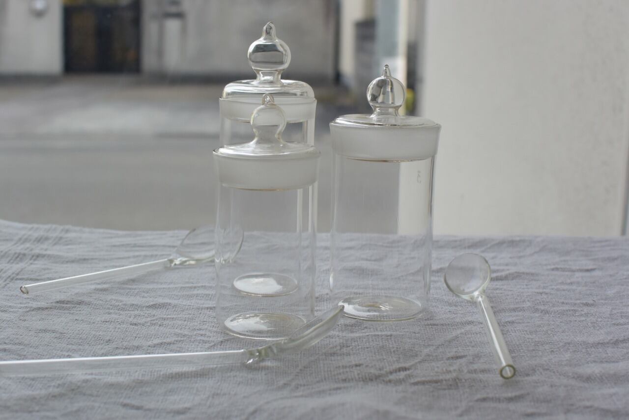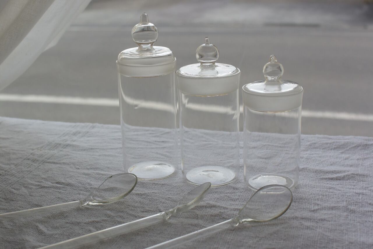 つまみの可愛らしいガラス容器とガラスのスプーン